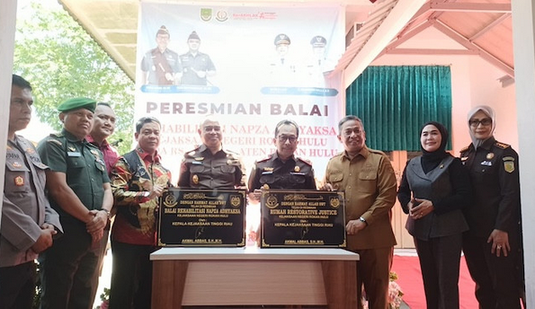 cara dilanjutkan dengan penandatanganan prasasti sebagai tanda Peresmian Balai Rehab, dan penarikan tirai secara seremonial, kemudian usai peresmian dilakukan peninjauan Balai Napza oleh Kajati di dampingi Bupati, Wabup, Kajari dan undangan lainnya (AD/MC Diskominfo Rohul).