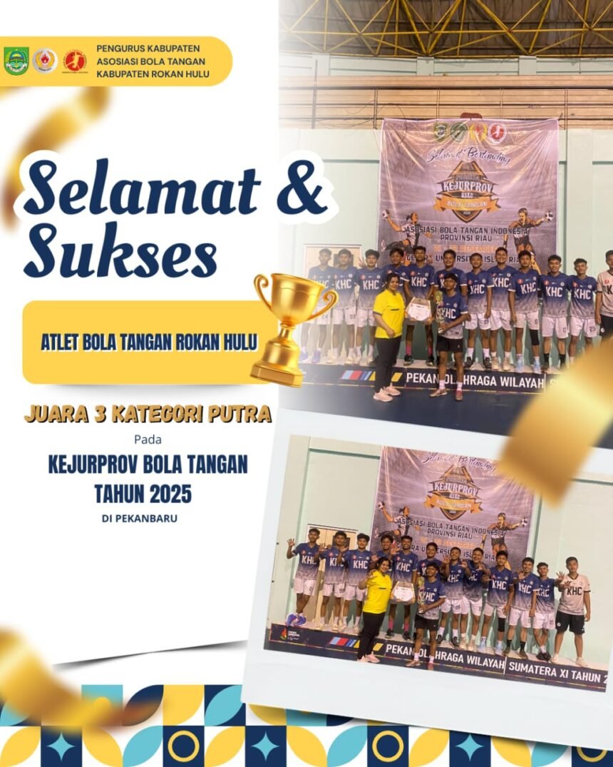 Pekanbaru – Kontingen Kabupaten Rokan Hulu (Rohul) berhasil menorehkan prestasi membanggakan dengan meraih Juara III Kategori Putra pada Kejuaraan Provinsi (KEJURPROV) Bola Tangan Riau Tahun 2025 yang digelar di GOR Voli Indoor Universitas Islam Riau (UIR), Pekanbaru, pada 22–23 Desember 2025.